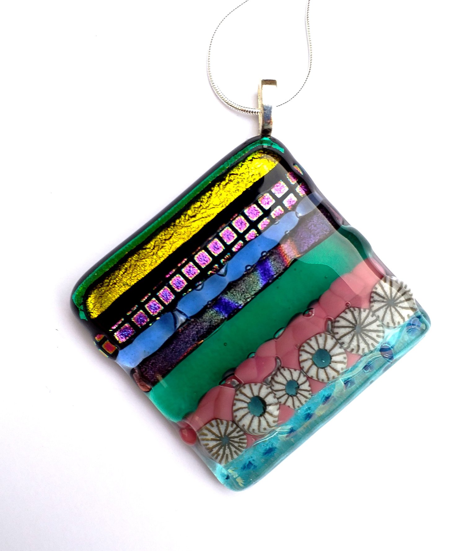 A growing colletion of pendants, inspired by the wild coastline of the North. I have created this piece, using Murrini, Dichroic ,Irridescent and hand painted glass.The necklace is silver and measures and attachment is silver plated. The size is 5 cm x 5cm, and is 9mm deep,and is made from a layer of coloured glass/ patterned glass and clear glass, that is fused at a high temperature. Each piece is lovingly hand made in the North east of England, and is packed in a presentation box.